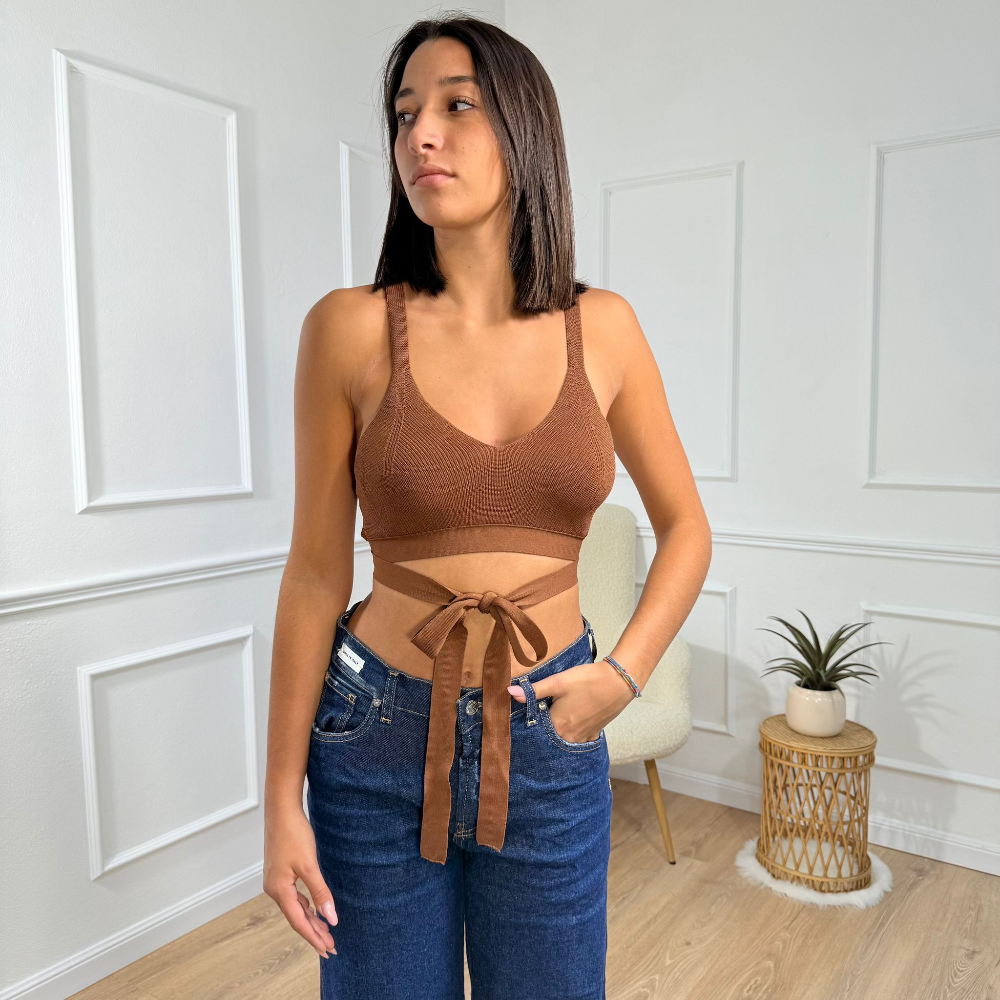 La modella è alta 1,73 m, misura 66 cm di vita e indossa la taglia S (40 italiana).