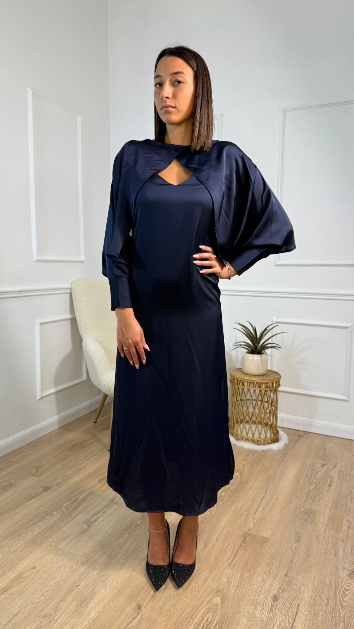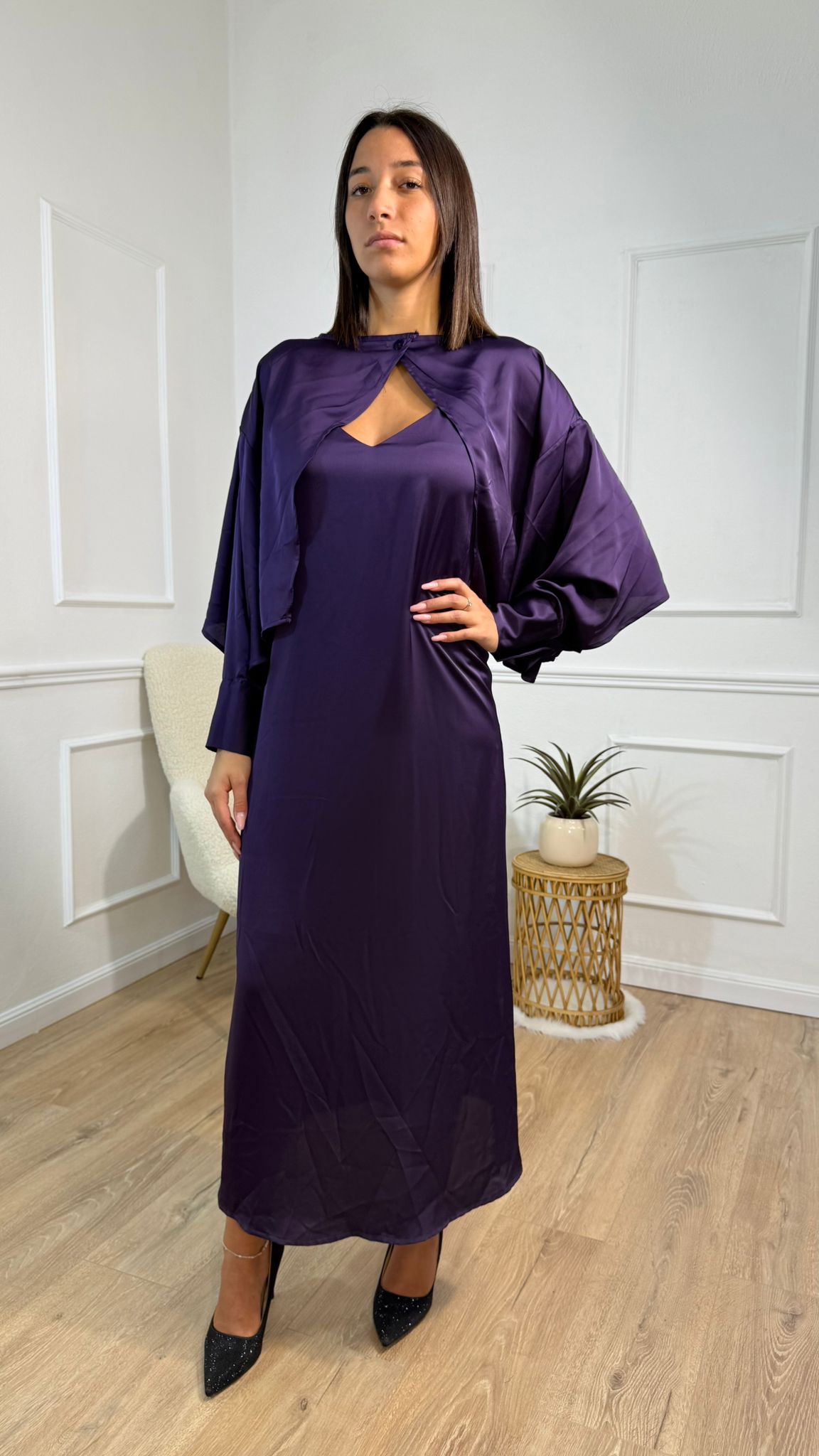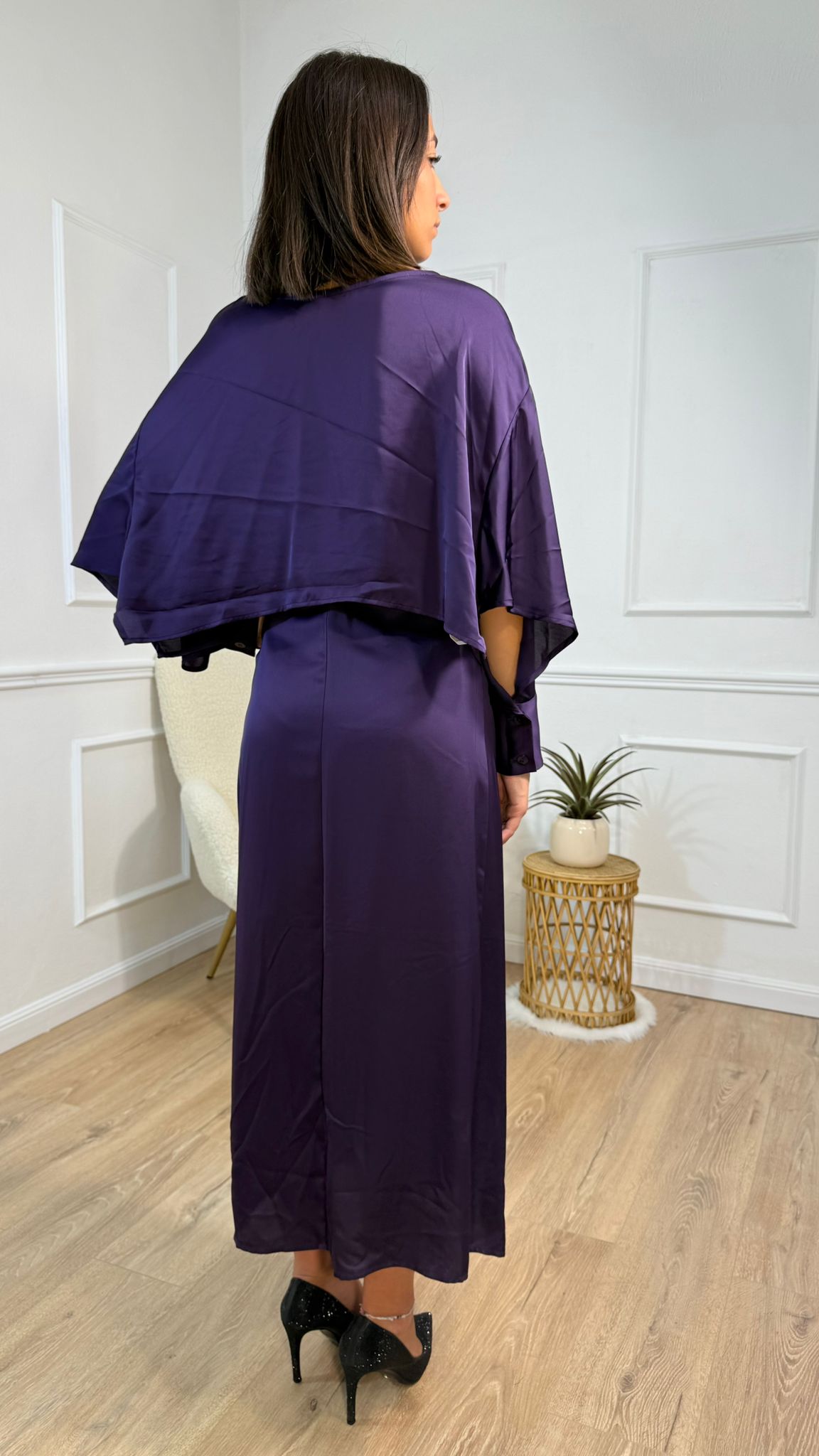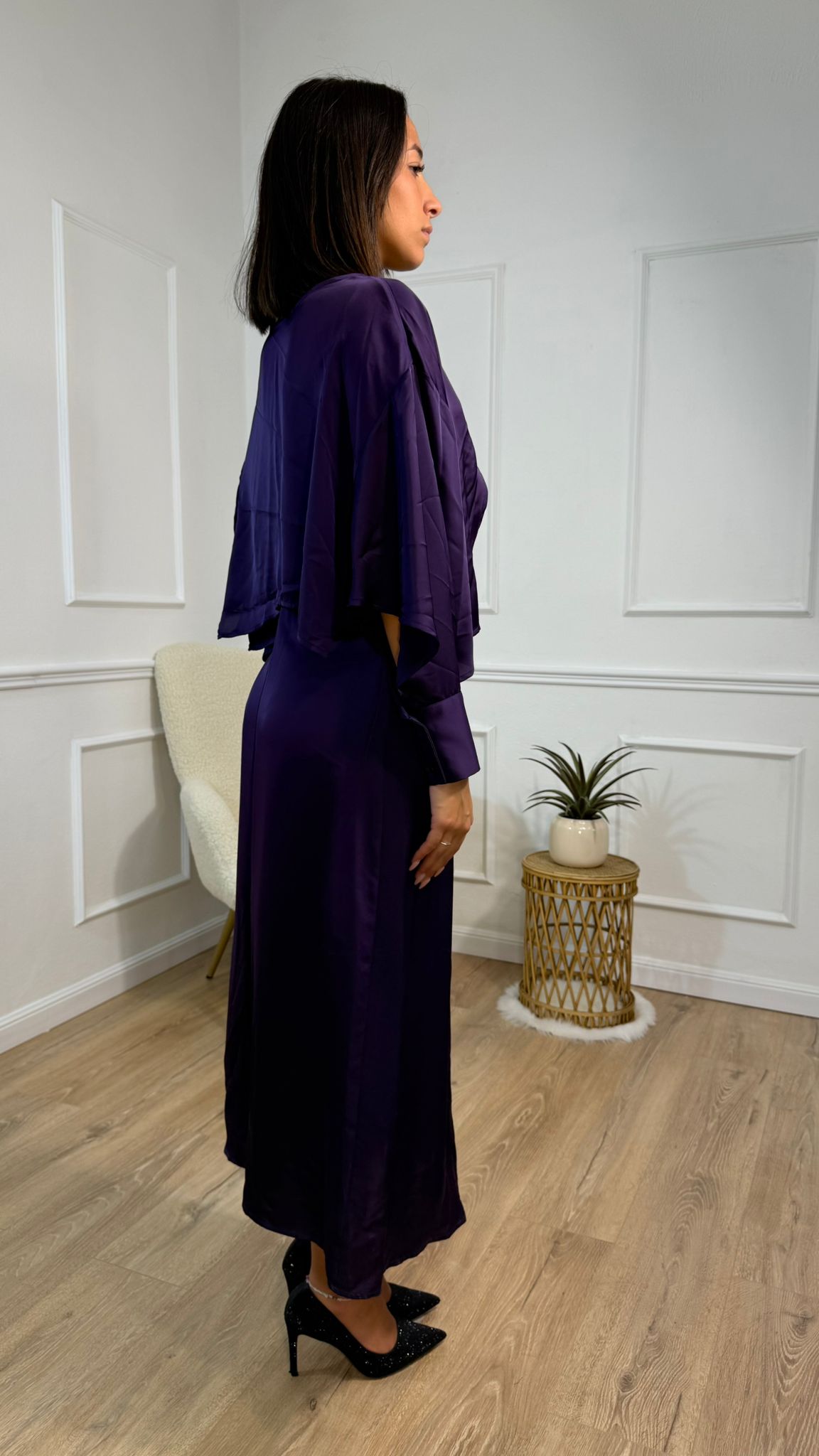 L’abito Merci, disponibile in elegante viola e blu scuro, si distingue per la mantella coordinata e le ampie maniche che donano un aspetto regale e sofisticato. Il taglio fluido e lo scollo a V aggiungono grazia e movimento, rendendolo ideale per cerimonie, eventi serali o momenti in cui desideri trasmettere un’eleganza senza tempo. Completato da scarpe nere a punta, questo abito crea un look raffinato e di classe superiore.