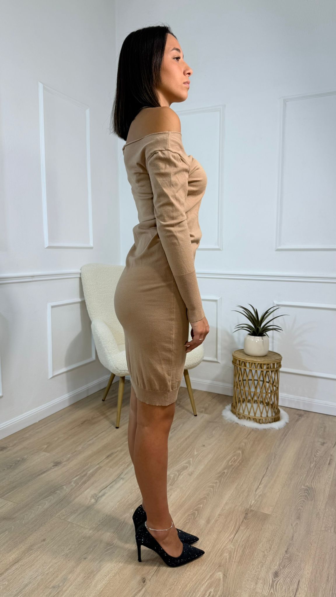 Questo abito aderente color cammello, con spalle scoperte e maniche lunghe in tessuto a costine, unisce sobrietà e sensualità con eleganza. La sua forma avvolgente valorizza la silhouette, mentre la tonalità calda lo rende perfetto per un outfit sofisticato da giorno o una serata informale con stile raffinato. Un capo versatile che aggiunge un tocco chic a ogni occasione.