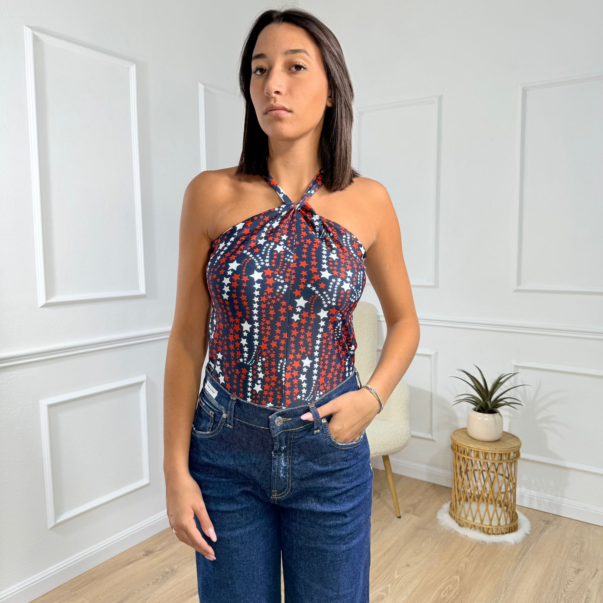 La modella è alta 1,73 m, misura 66 cm di vita e indossa la taglia S (40 italiana).