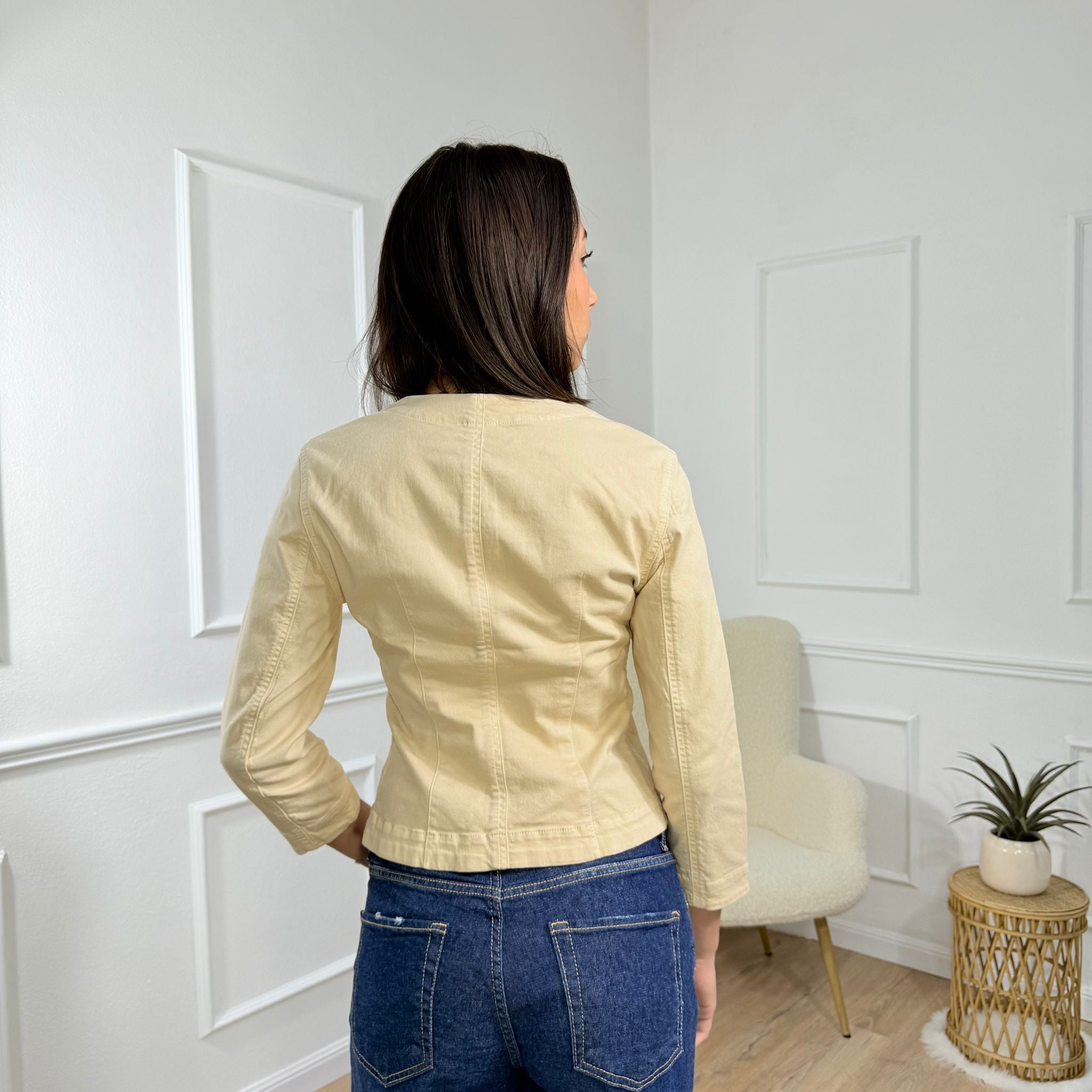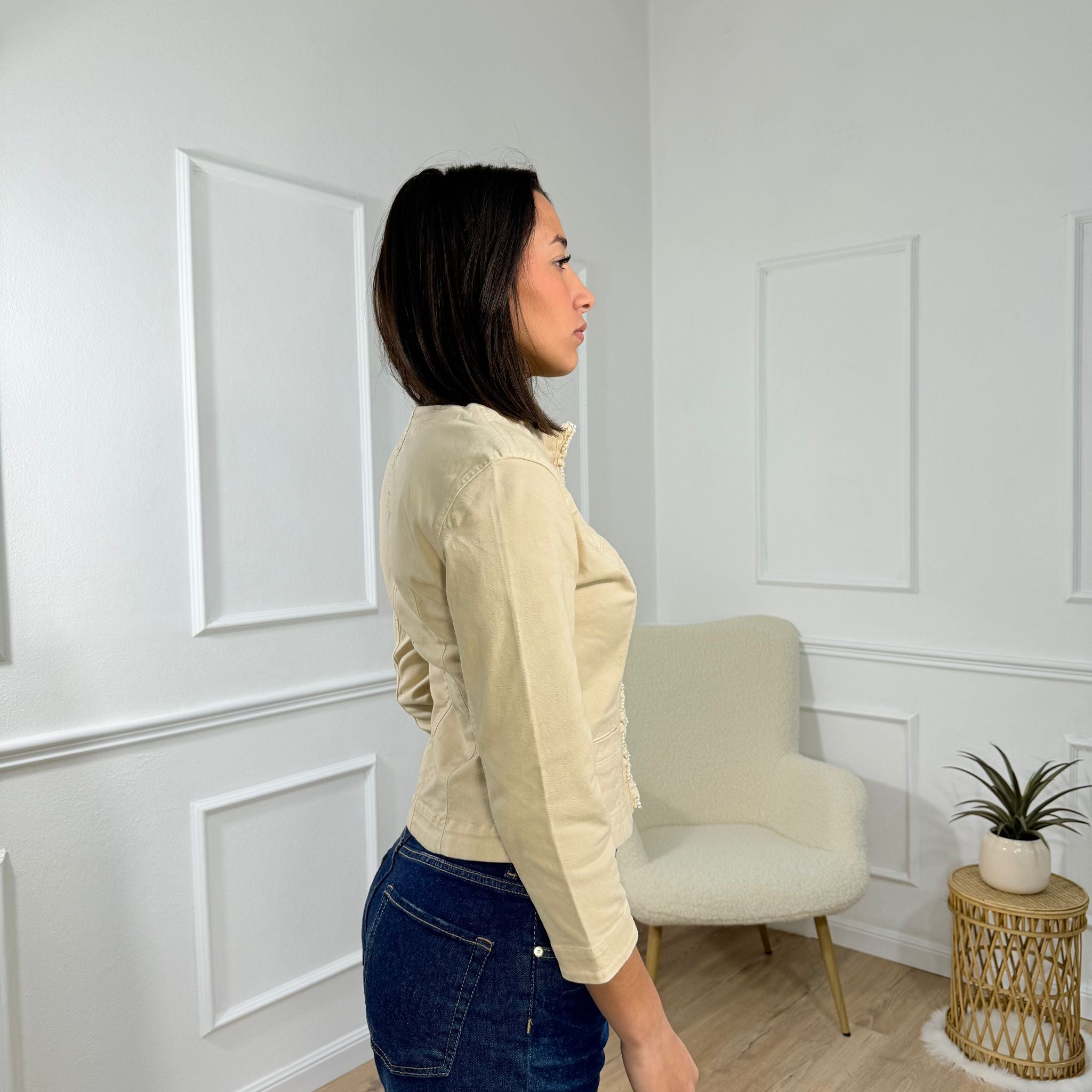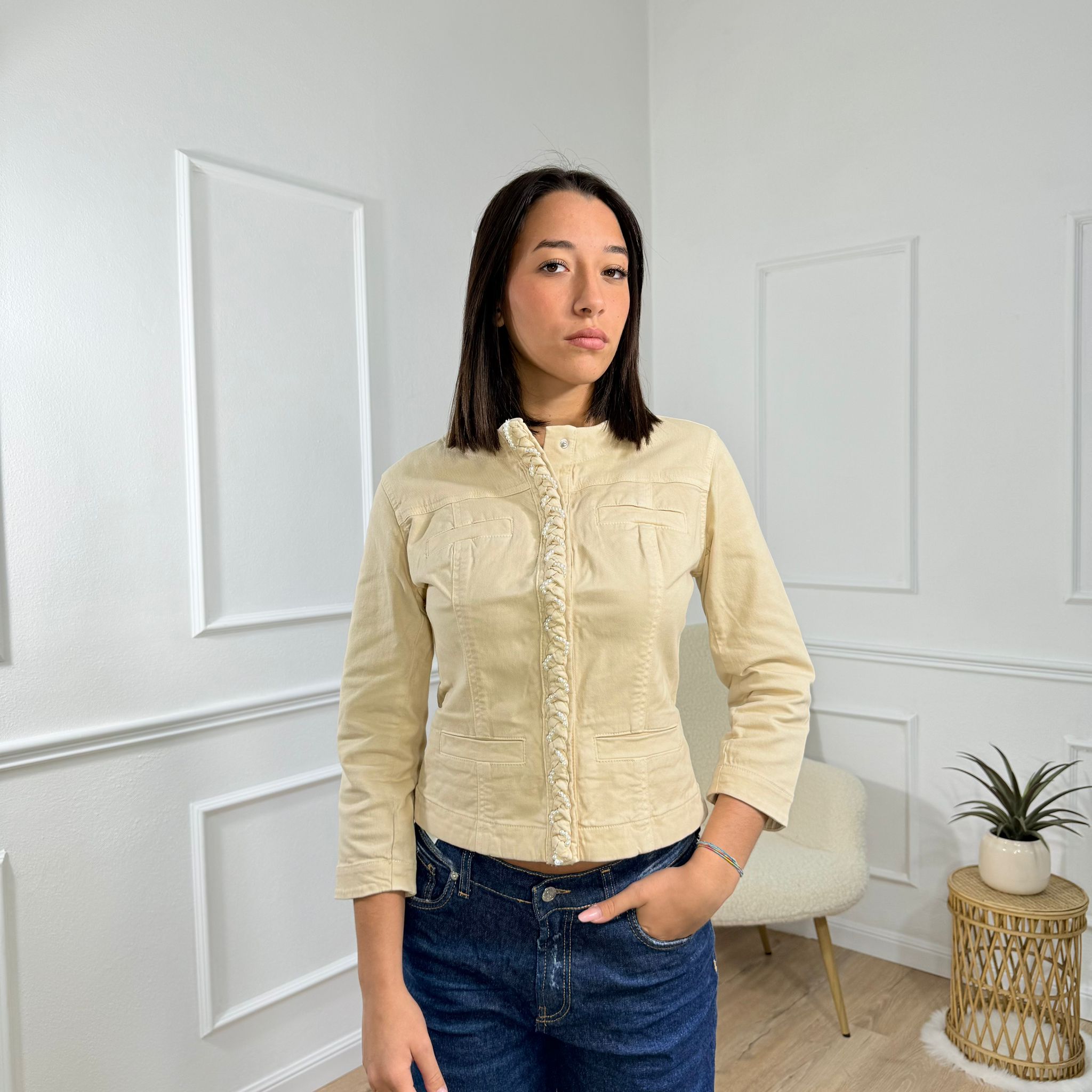 La modella è alta 1,73 m, misura 66 cm di vita e indossa la taglia S (40 italiana).