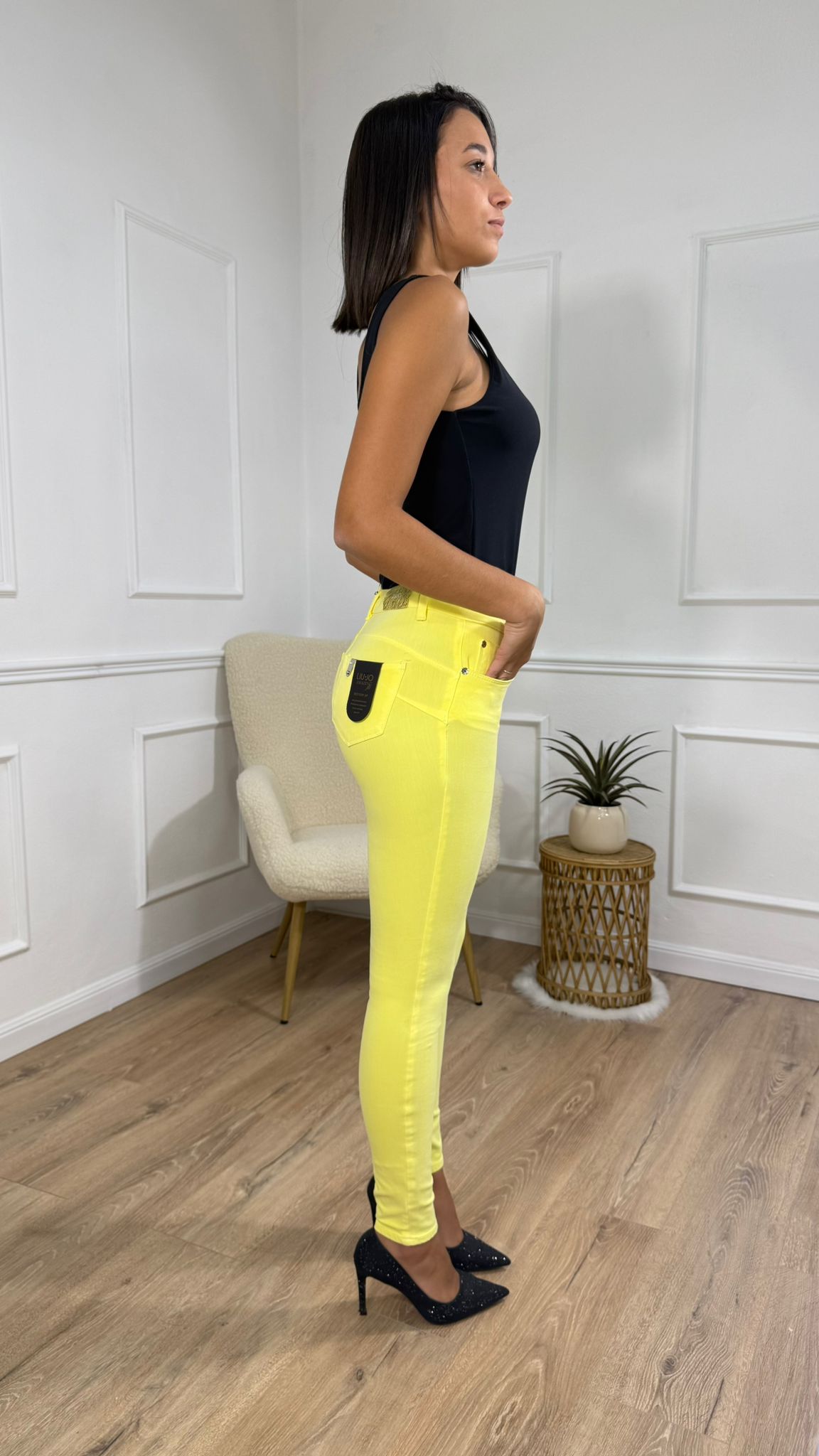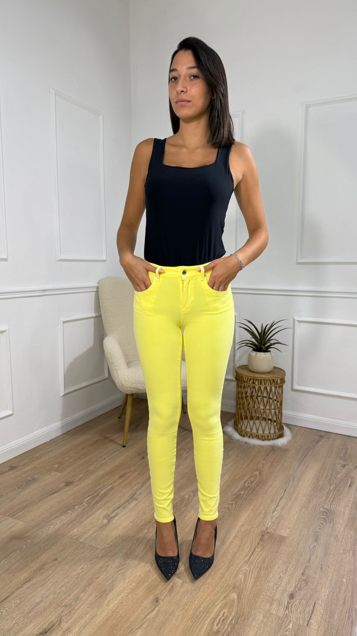 I jeans skinny in un vibrante giallo acceso offrono una vestibilità aderente che valorizza la silhouette su tutta la gamba. Ideali per chi cerca uno stile energico e originale, sono perfetti per creare look audaci e moderni. La loro tonalità intensa aggiunge un tocco di personalità unico a ogni outfit.