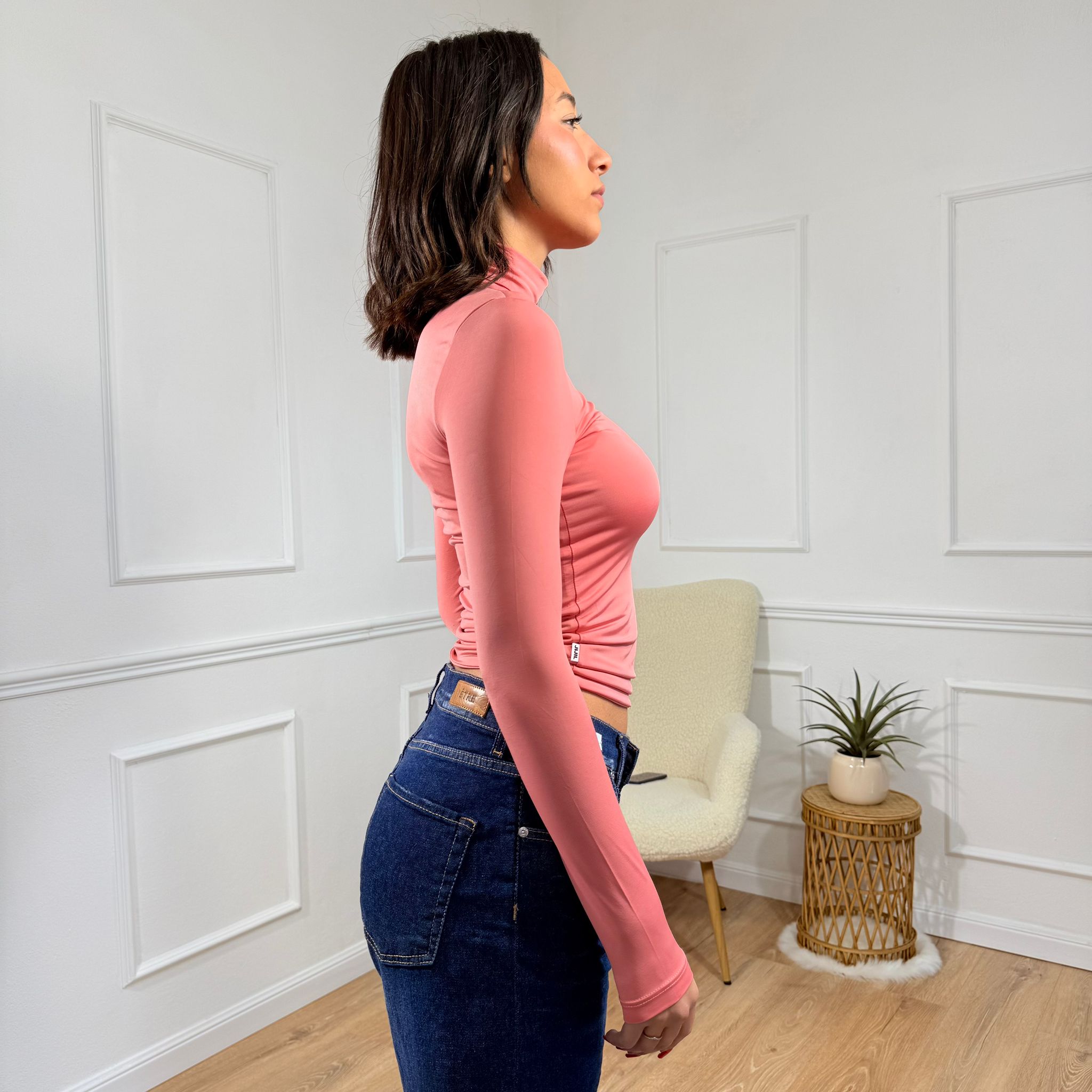 Questa maglia a maniche lunghe con collo alto combina eleganza e semplicità. La vestibilità aderente esalta la silhouette con discrezione, mentre il tessuto elasticizzato garantisce comfort e libertà di movimento. Perfetta per chi cerca un capo versatile da indossare sia in contesti casual che più sofisticati, aggiunge un raffinato tocco di stile a ogni abbigliamento.