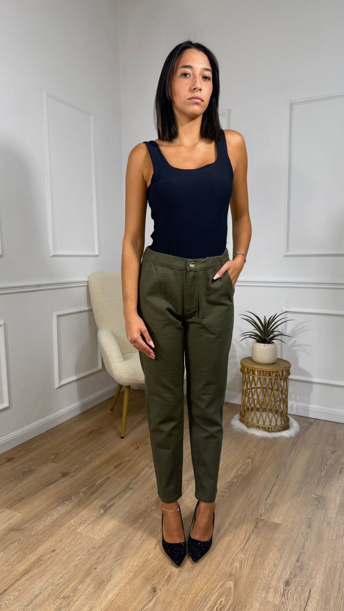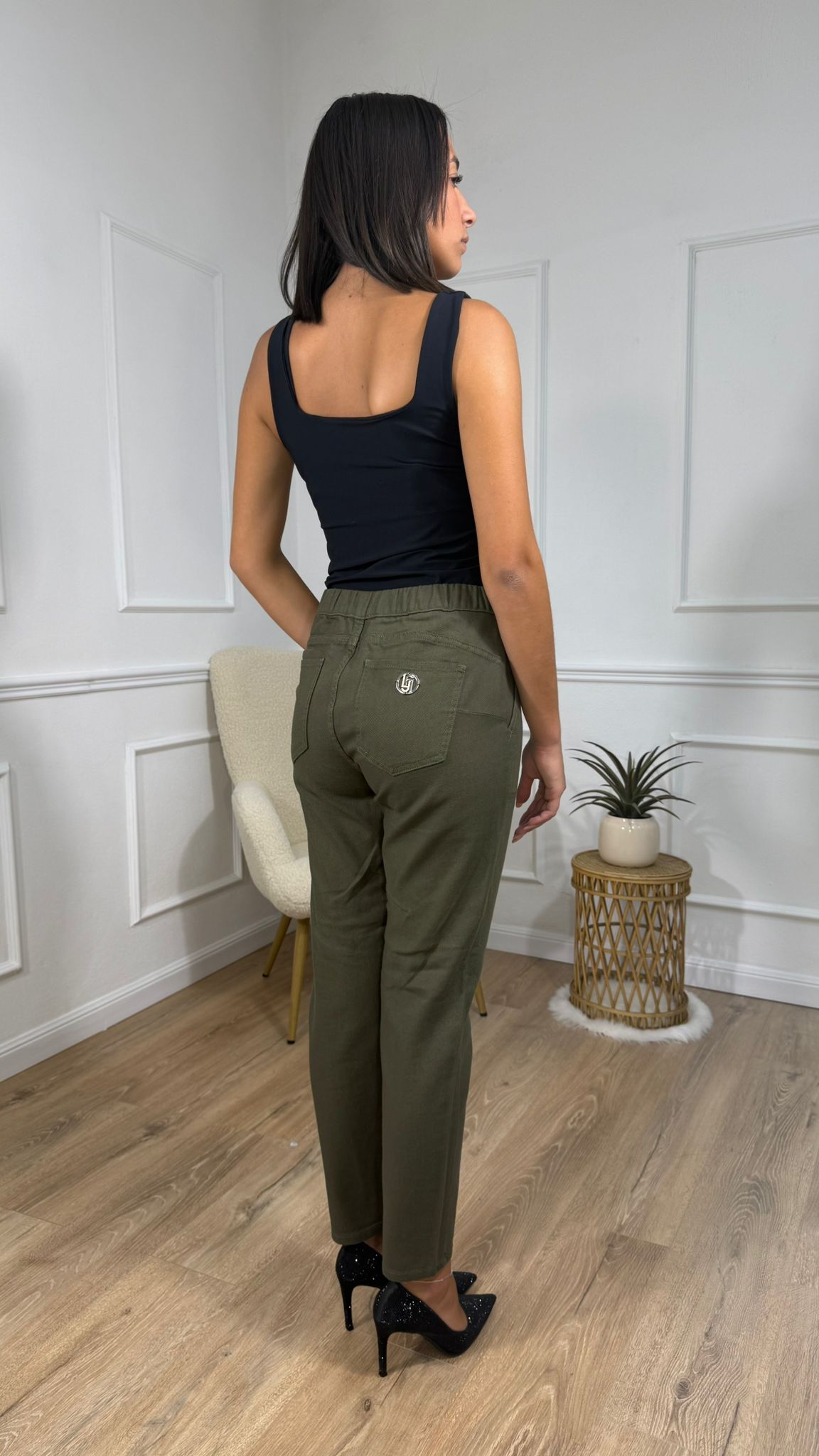 Questi pantaloni verde oliva a vita alta presentano un taglio dritto che valorizza la silhouette con eleganza discreta. Il design sobrio e naturale li rende ideali per un look rilassato ma sofisticato, perfetti per occasioni sia casual che più formali. Realizzati con materiali di qualità, assicurano comfort e stile senza compromessi.