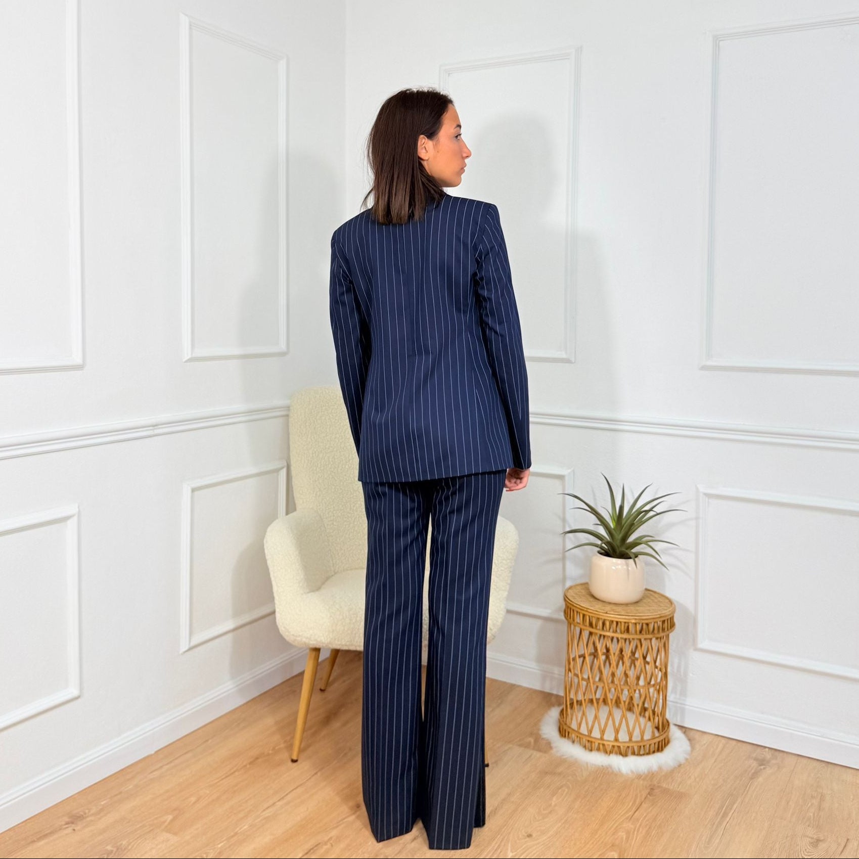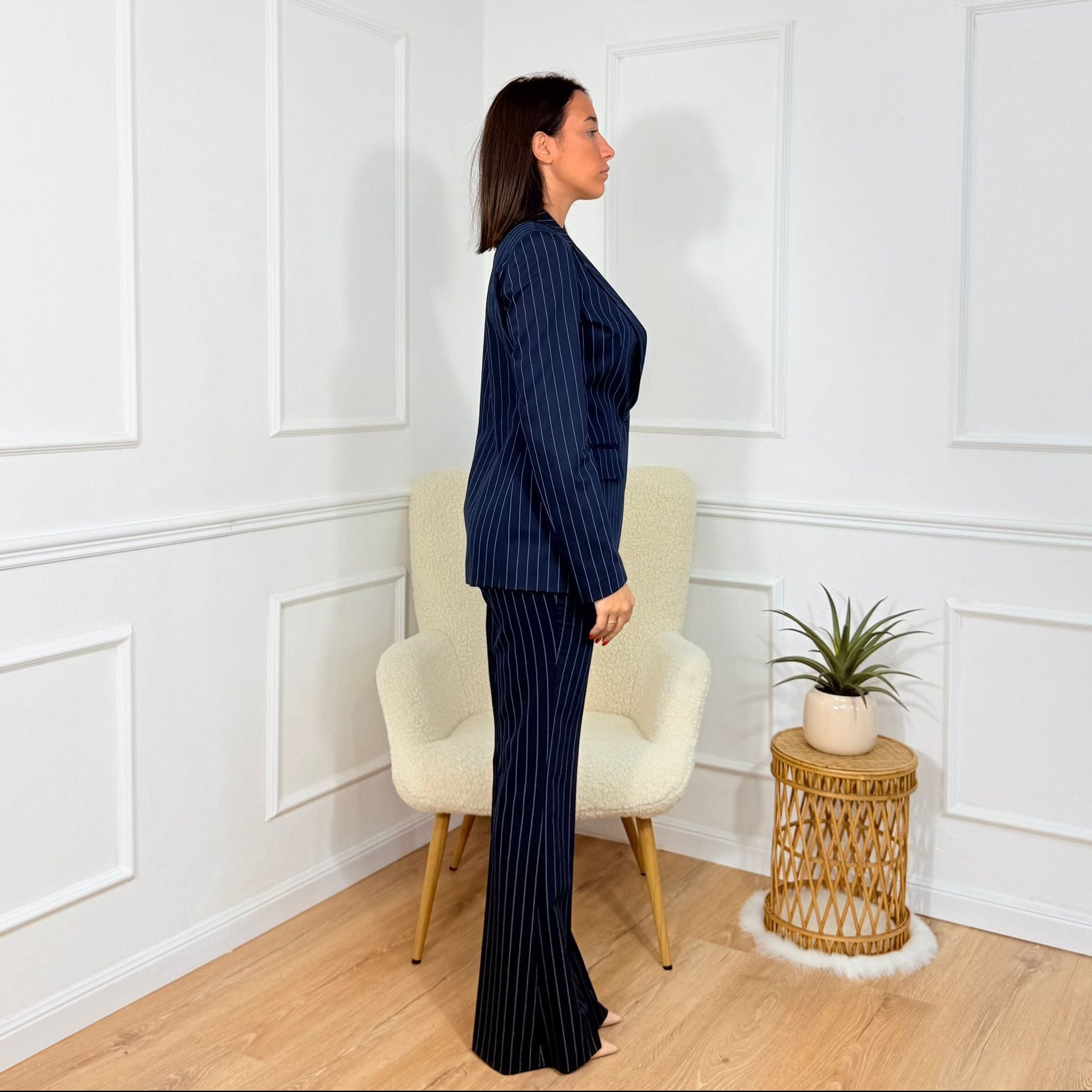 Tailleur sartoriale con giacca scollata e pantaloni a zampa Cristina Effe Blu gessato