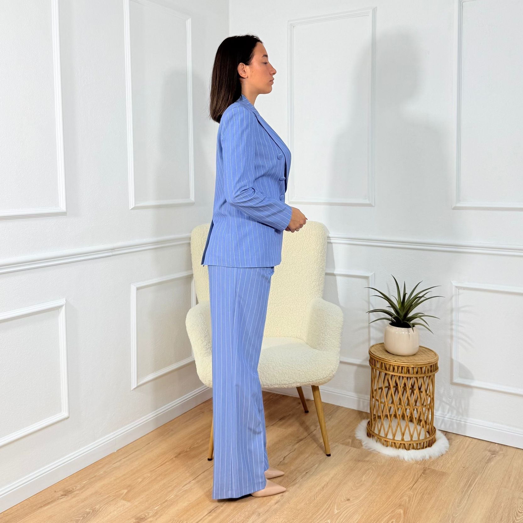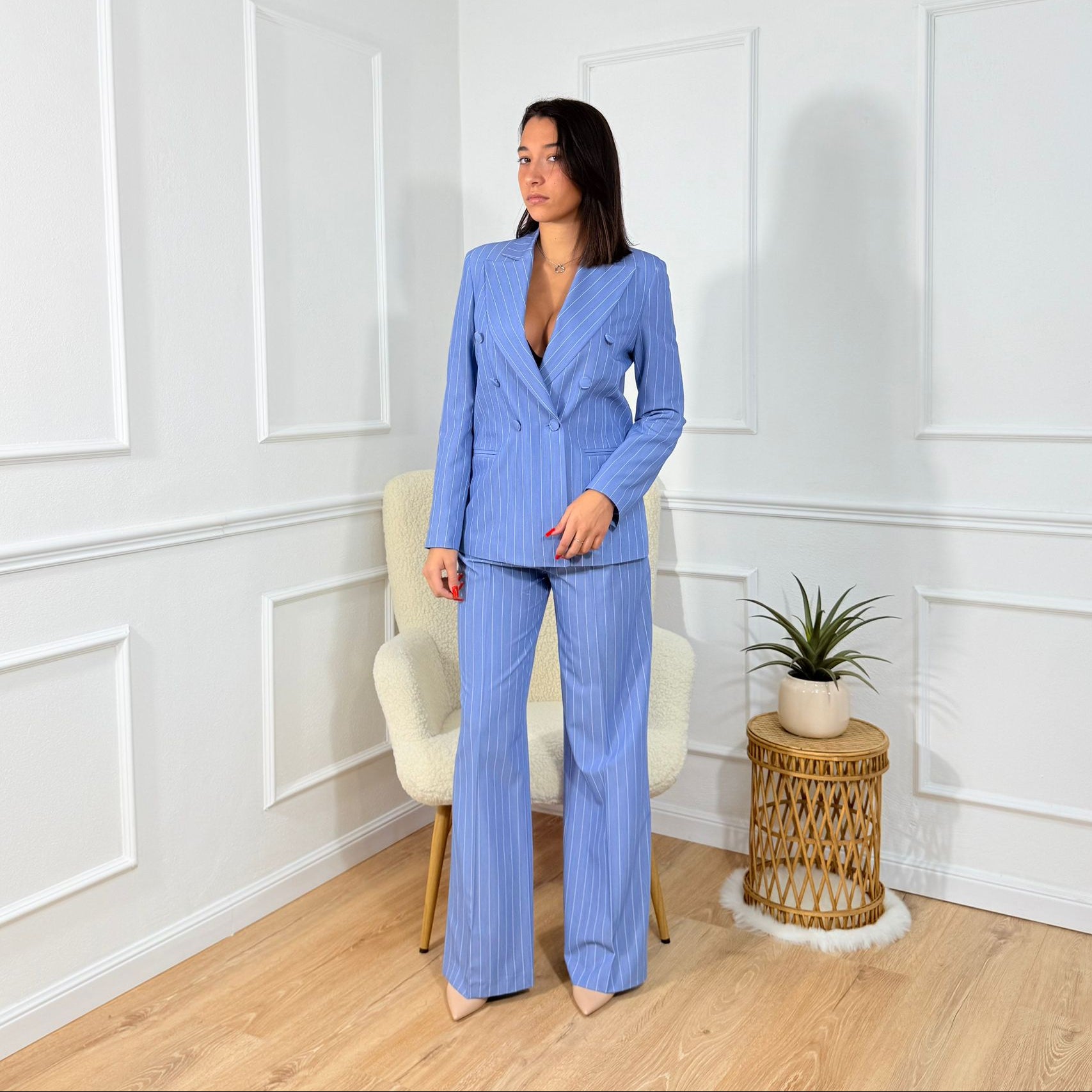 Tailleur sartoriale con giacca scollata e pantaloni a zampa Tona Risci Celeste gessato