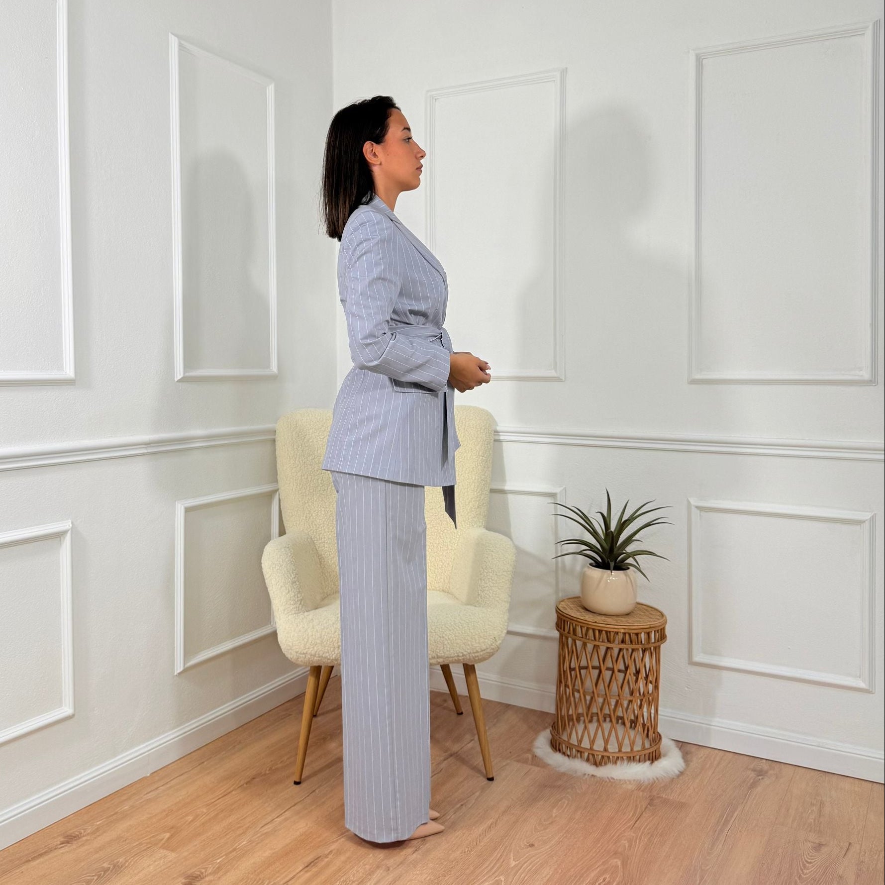 Questo tailleur in grigio chiaro con motivo gessato sottile unisce eleganza e raffinatezza grazie al blazer dal profondo scollo completato da una cintura in vita e ai pantaloni ampi coordinati. Il taglio sartoriale e la palette neutra lo rendono ideale per ambienti professionali, shooting o eventi speciali, trasmettendo equilibrio e sicurezza in ogni occasione.