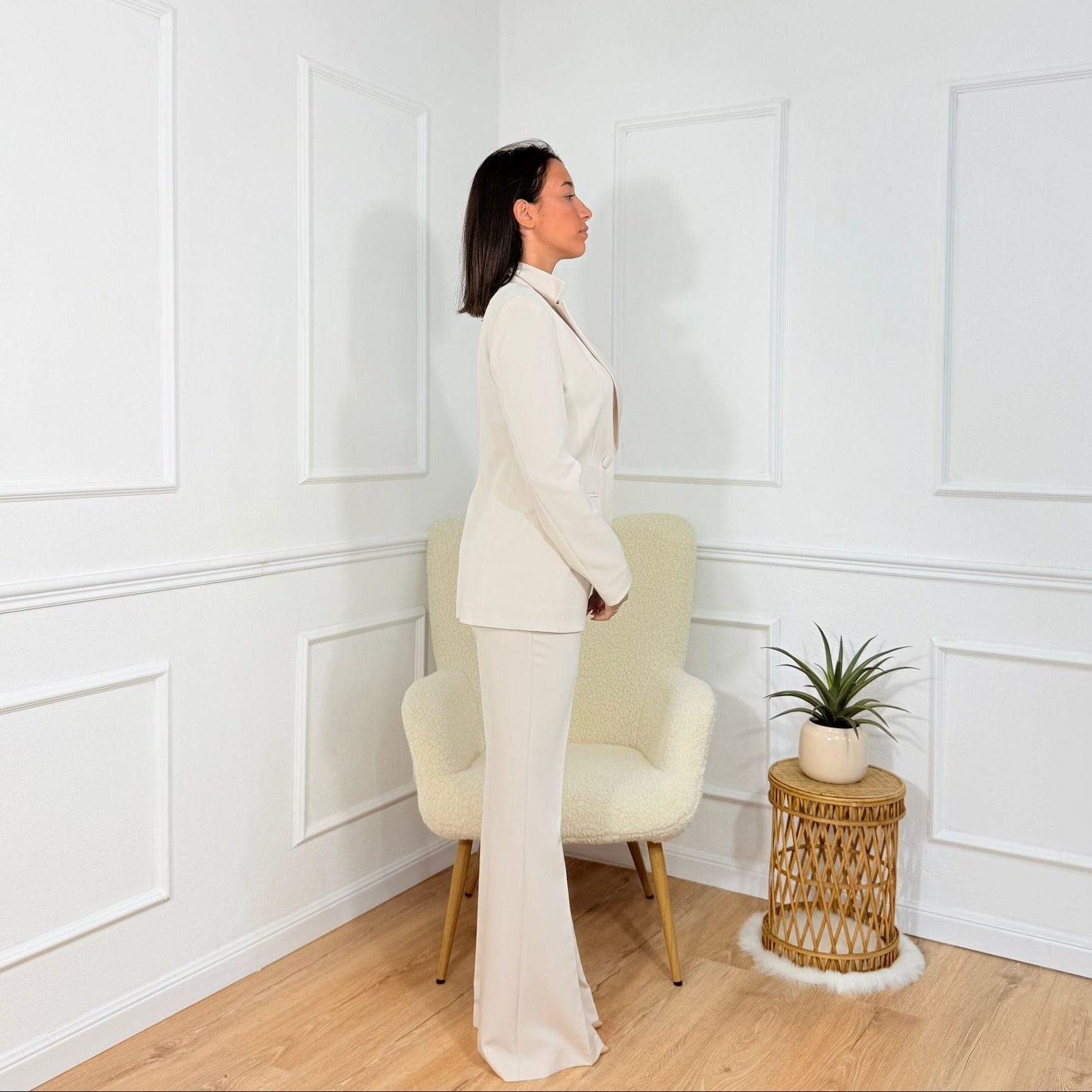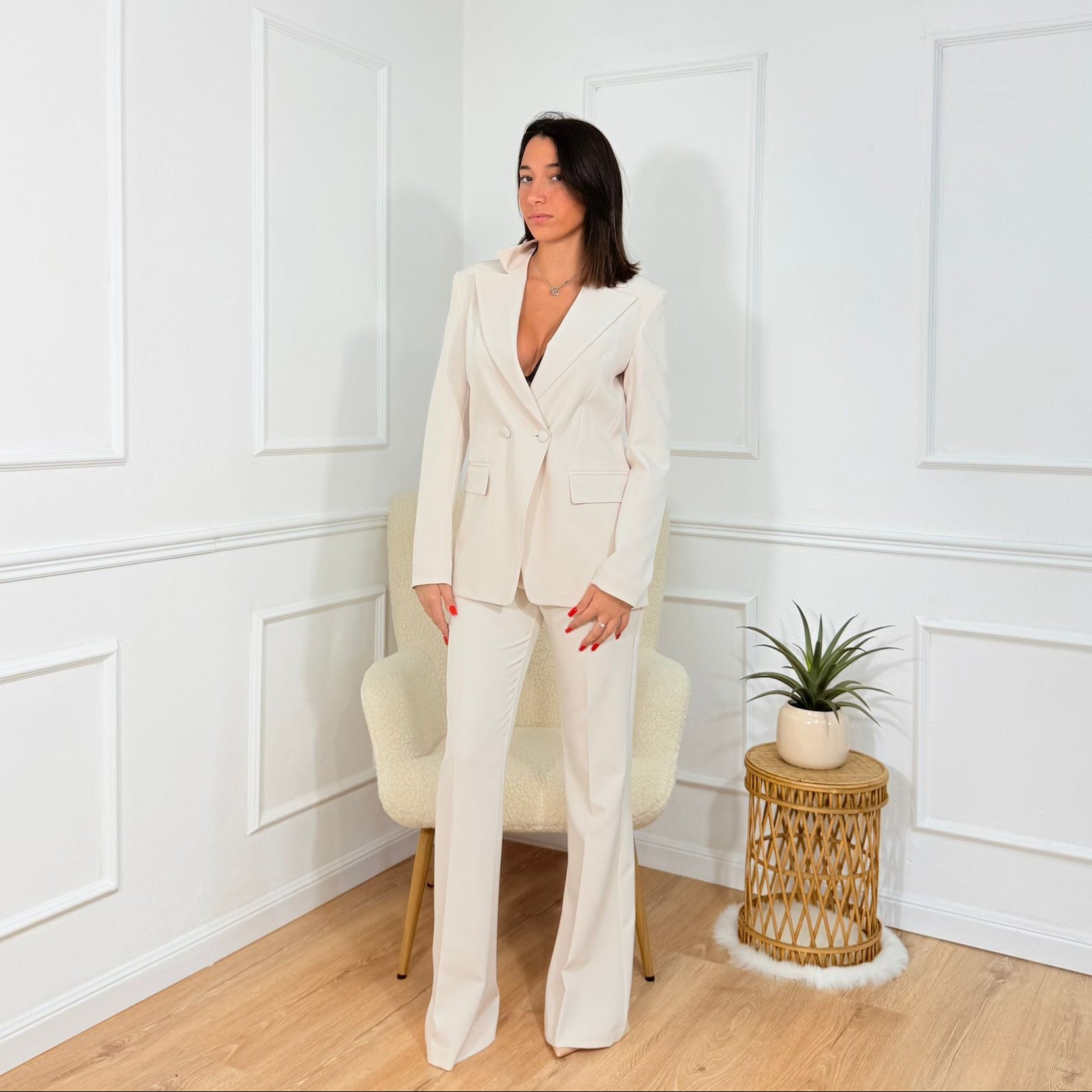 Tailleur sartoriale con giacca scollata e pantaloni a zampa Cristina Effe Panna