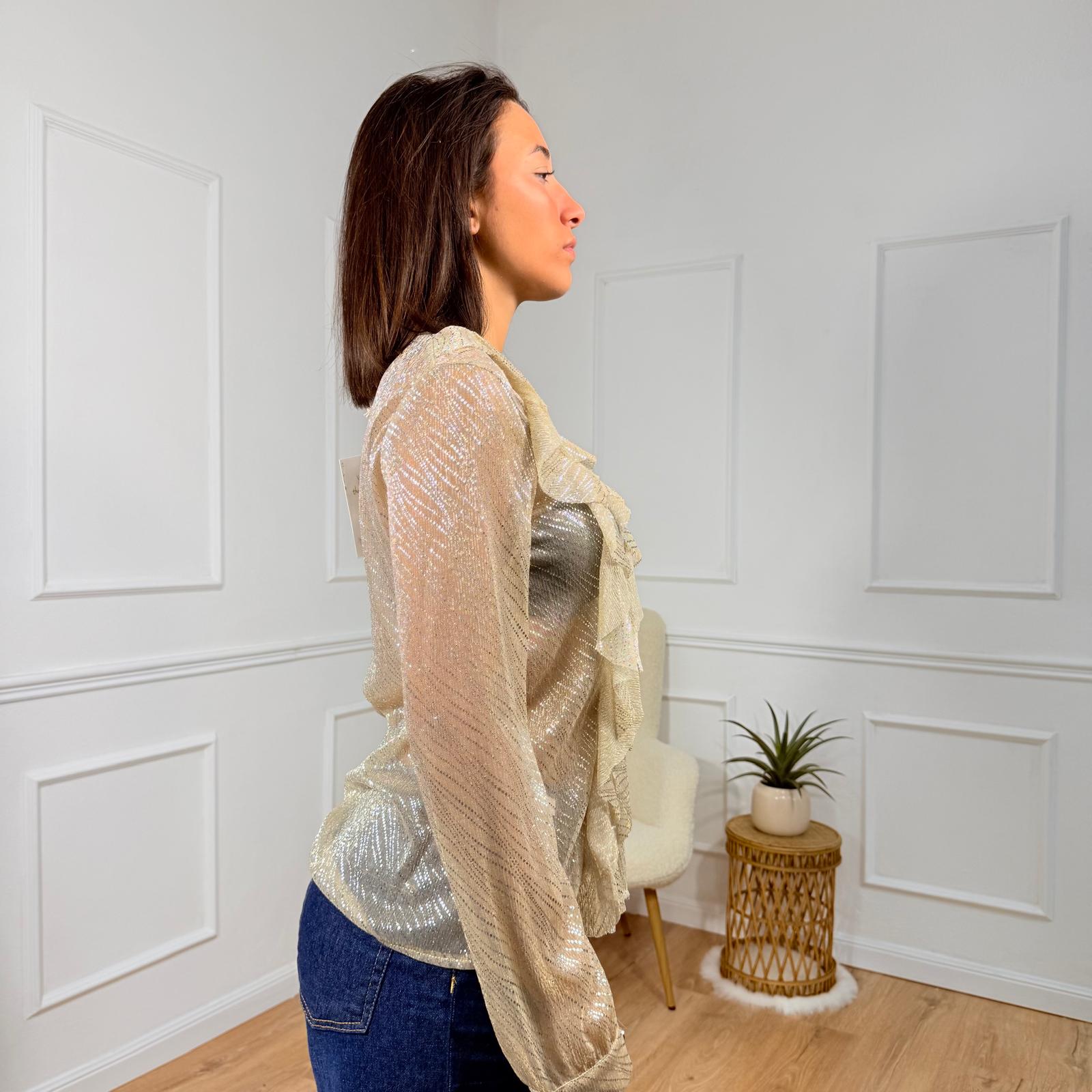 Blusa trasparente con fiocco e balze decorative Merci Oro